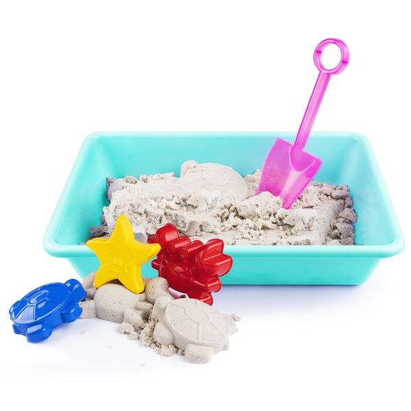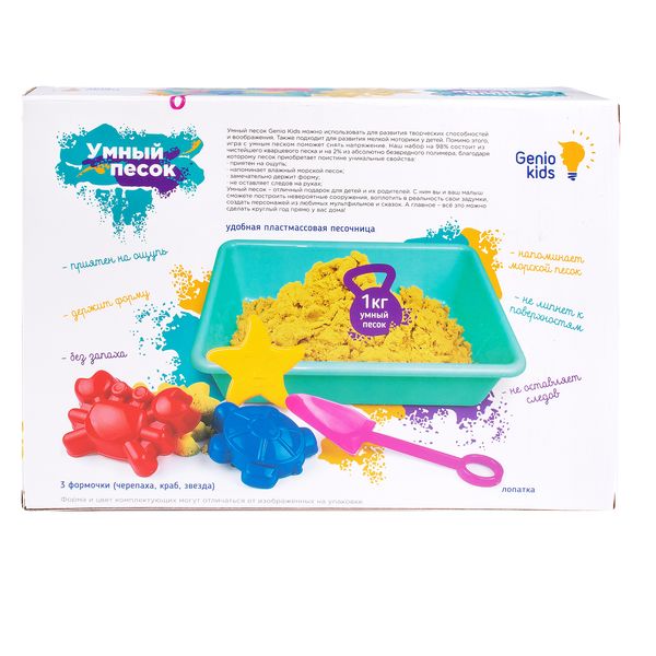 Благодаря входящей в набор пластиковой песочнице, лопатке и формочкам, можно легко играть с умным песком, не выходя из дома на улицу. Что особо понравится малышу, если он лишён возможности погулять из-за плохой погоды.Песочница определит зону для игры с песком и поможет сохранить порядок в доме. Набор Genio Kids развивает творческие способности и воображение. Также подходит для развития мелкой моторики у детей. Не оставляет пятен, не липнет к рукам, не засыхает, очень приятен на ощупь и напоминает морской песок. В состав набора входит 1 кг Умного песка, пластмассовая песочница, лопатка, 3 формочки.